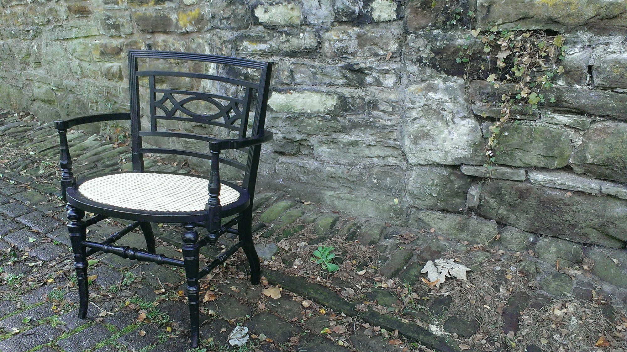 So unusual and stylish with it's Aesthetic design and Victorian background. Japanned black and newly re-caned hand woven seat. It has marks and scratches according to it's age and past but these do not detract from it's stylishness.